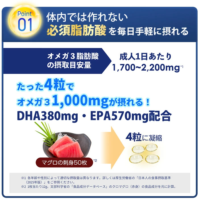 また、1日4粒(目安)でDHA380mg・EPA570mg、計950mgのオメガ3を摂取できるのが特徴です。