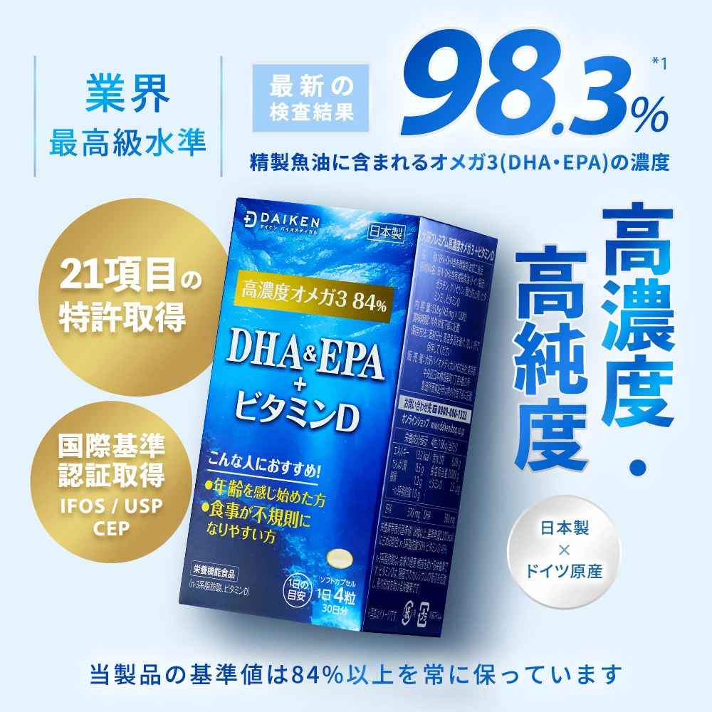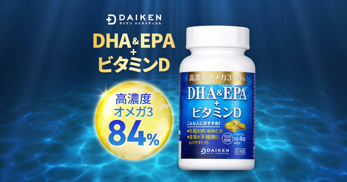 ダイケンの「DHA&EPA+ビタミンD」は、高濃度オメガ3とビタミンDを手軽に摂れるサプリです。