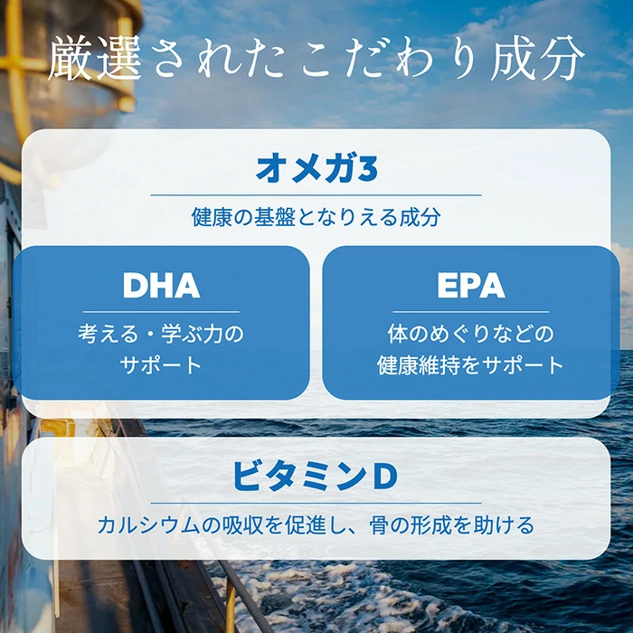 青魚のサラサラ成分「DHA」「EPA」といったオメガ3脂肪酸(以下、オメガ3)が、98.3%配合されています。